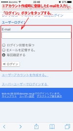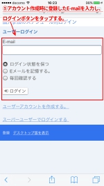 ⑤アカウント作成時に登録したE-mailを入力し、 ログインボタンをタップする。