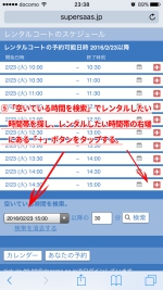⑤「空いている時間を検索」でレンタルしたい時間帯を探し、レンタルしたい時間帯の右端にある「+」ボタンをタップする。